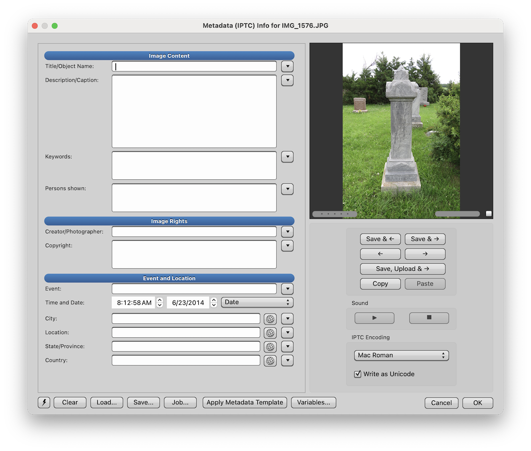First you have to find a software product that “speaks the language” of IPTC and EXIF so you can edit all these metadata fields. IPTC provides a helpful list of software products that support IPTC. Unless you’re a digital photography professional, you might not recognize many of these products. Most of them are pretty expensive. A highly regarded (but tech-y) free one, ExifTool, won’t install onto my Mac computer because Apple thinks it has embedded malware in it. It actually does not have malware in it; the developer just doesn’t want to pay Apple’s extortion-like developer fee (he provides work-arounds here).